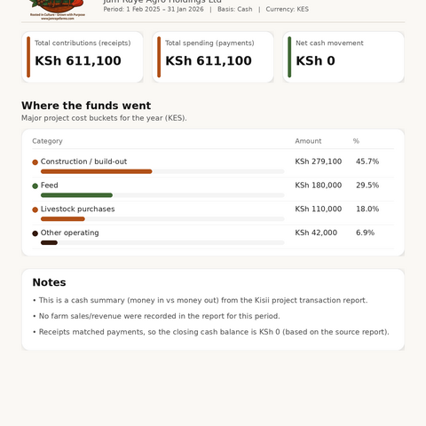 20% Site Retained Earnings: Stays on the Kisii farm for maintenance, feed buffers, and continuous improvement (OpEx).