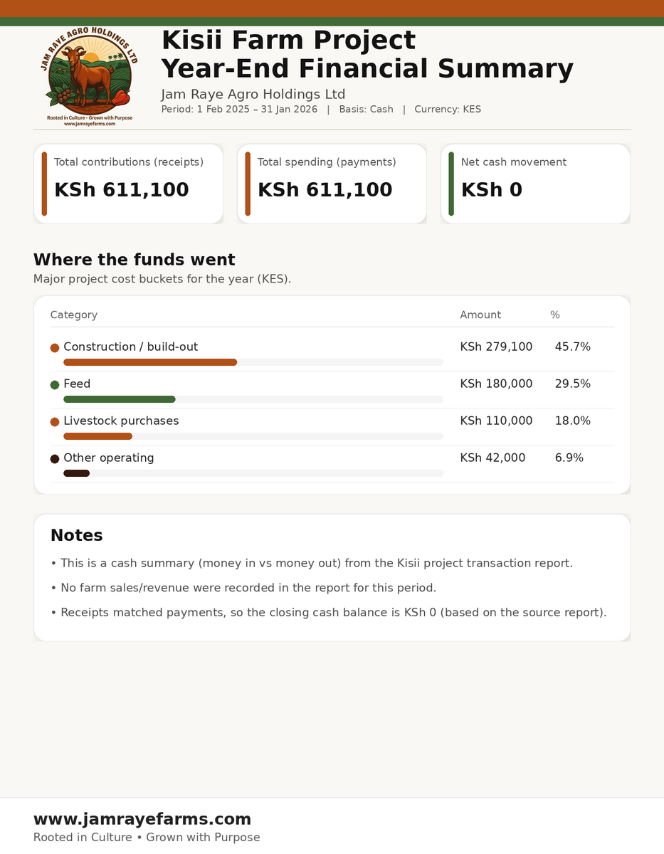 Governance Note: Impact-First Model Jam Raye Agro Holdings operates as a Social Enterprise. 100% of contributions are ring-fenced for direct farm infrastructure to fuel food security and generational change.